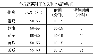 温汤浸种可以杀死潜伏在种子表面和内部的病原菌。几种主要蔬菜种子的烫种水温和时间见下表。
