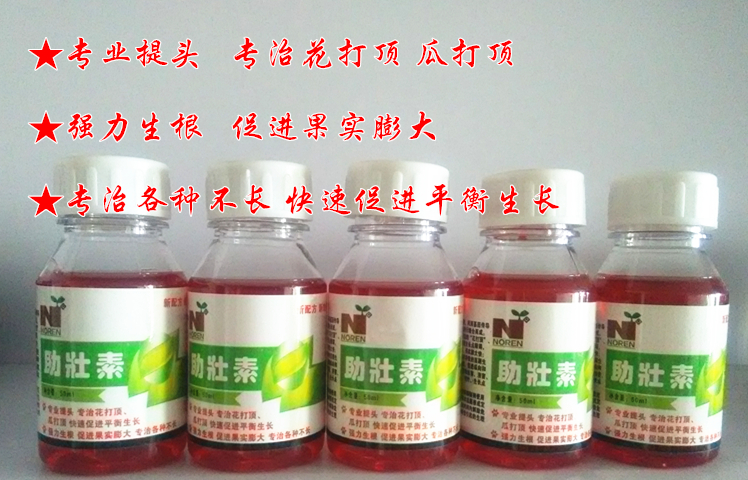 助壮素——专治生理性和药物性引起的“花打顶”、“瓜打顶”,能迅速提头,打破生长点障碍,促进生长点生长。新叶增多,果实膨大快;解决僵苗、小老苗及药物残留导致的苗期生长慢、“封头”等生理性病害,促进纵向和横向平衡快速生长;专治药害和冻害、涝害、冰雹等各种灾害造成的落叶、黄叶、生长点损害,快速恢复生长。
