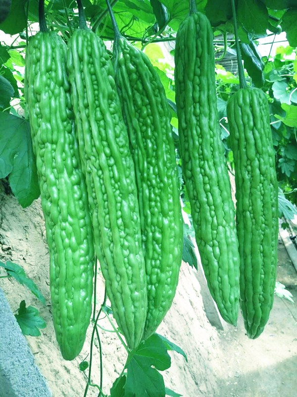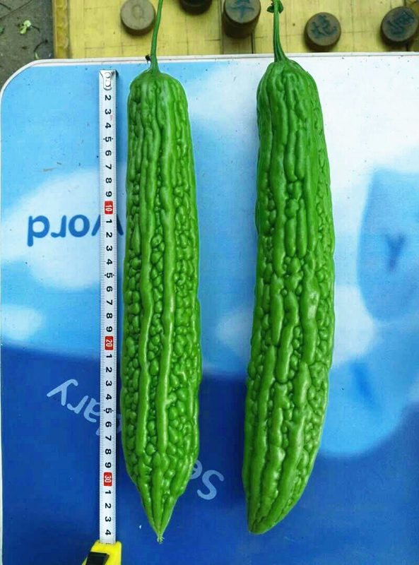 最新育成杂交一代苦瓜品种,瓜色碧绿色,圆粒瘤与短纵瘤相间,光泽度好。