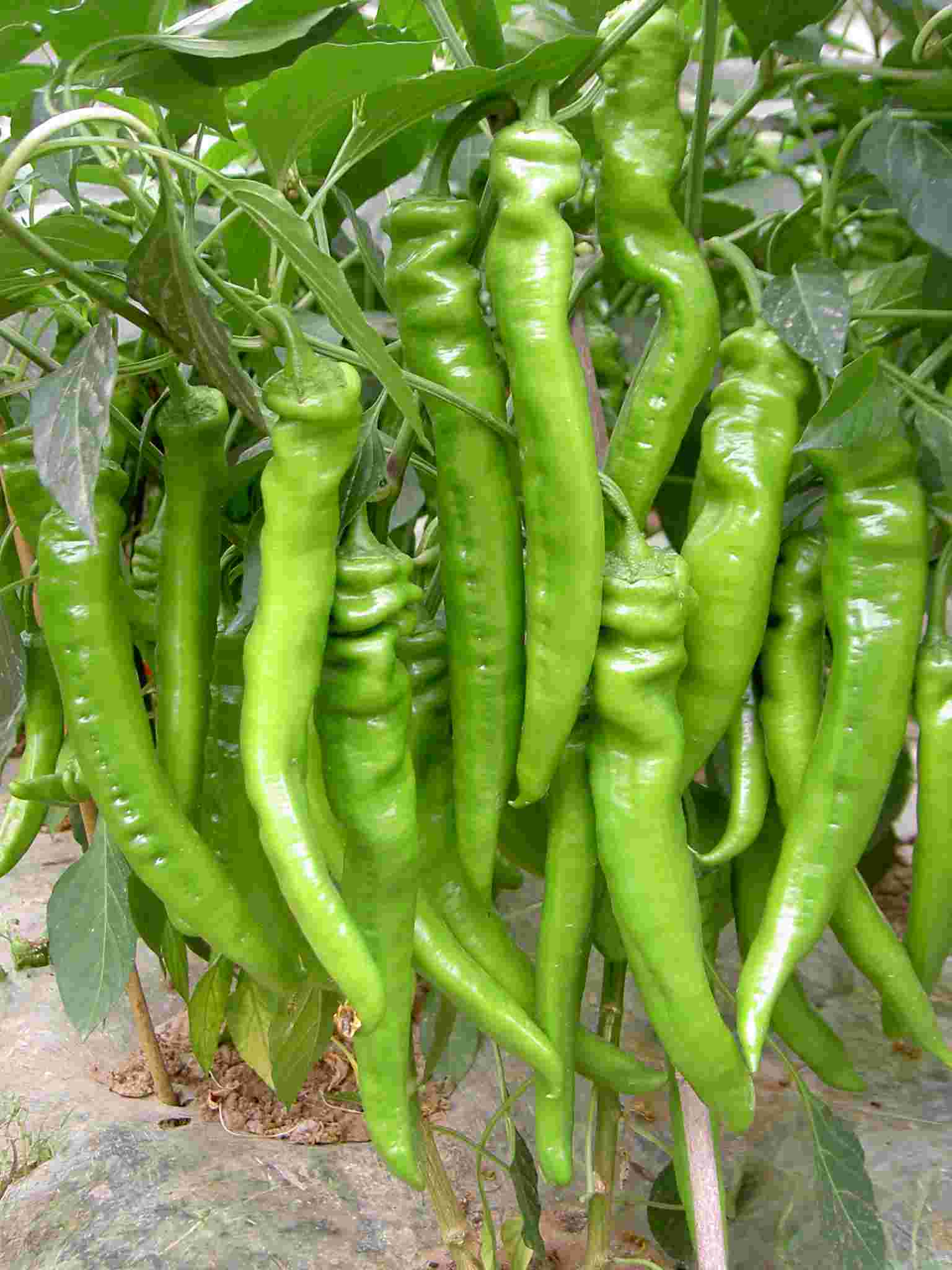 特征特性:国外引进,杂交一代,属于中早熟大果无限生长型尖椒品种。果皮浅黄绿色,果肉厚,辣味浓,果型顺直,果实长25-35厘米,径5-6厘米,单果重150-200克左右。抗寒、抗病能力强,植株长势旺盛,连续坐果带果能力极强,膨果快,产量高。质地硬,极耐贮运,适合冬、春茬日光温室,早春大拱棚和冷凉地区露地栽培。